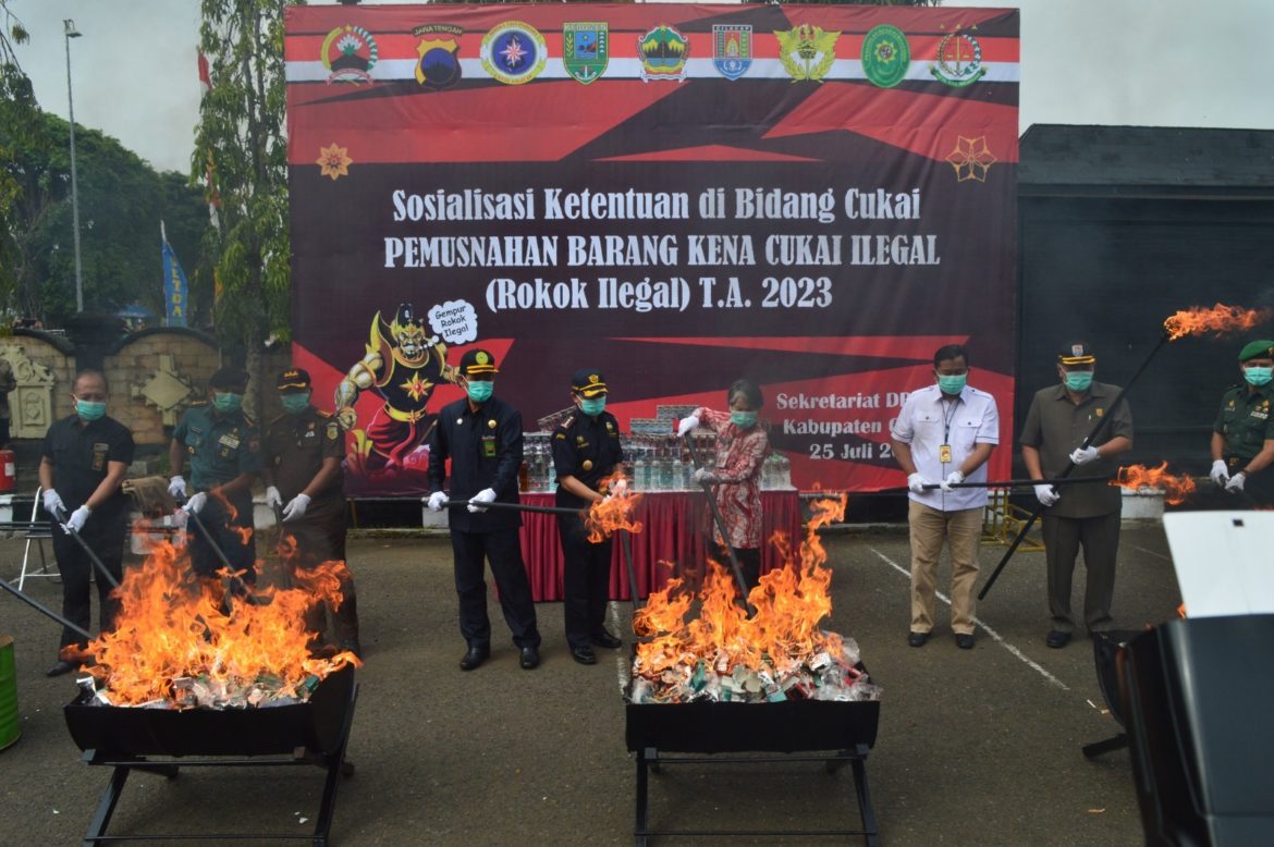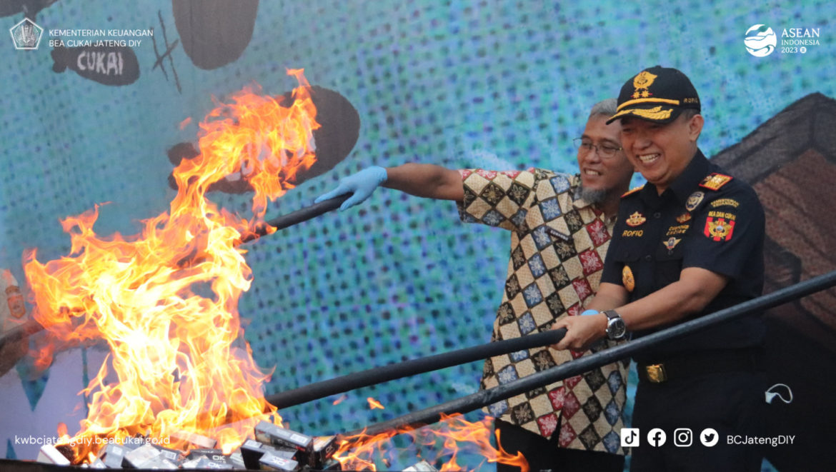 Semarang, 27-07-2023 – Kantor Wilayah Bea Cukai Jawa Tengah dan DIY bersama Pemerintah Daerah Jawa Tengah dan Forum Komunikasi Pimpinan Daerah (Forkopimda) menggelar pemusnahan rokok ilegal pada Rabu, 26 Juli 2023. Digelar di halaman Kantor Gubernur Jawa Tengah, pemusnahan dilakukan terhadap kurang lebih 10 juta batang rokok ilegal, hasil penindakan semester II tahun 2022.